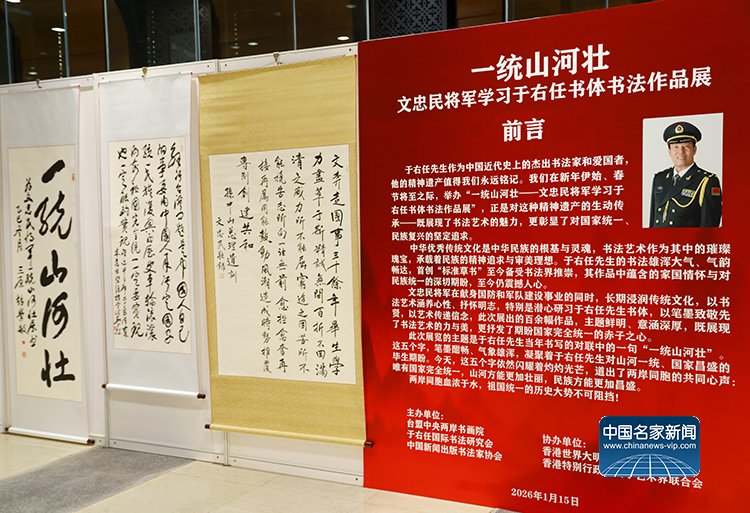 1月15日,由台盟中央两岸书画院、于右任国际书法研究会、中国新闻出版书法家协会联合主办,世界大明基金会(香港)、香港特别行政区文学艺术界联合会协办的“一统山河壮——文忠民将军学习于右任书体书法作品展”在北京台湾会馆隆重开幕