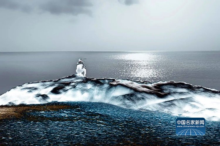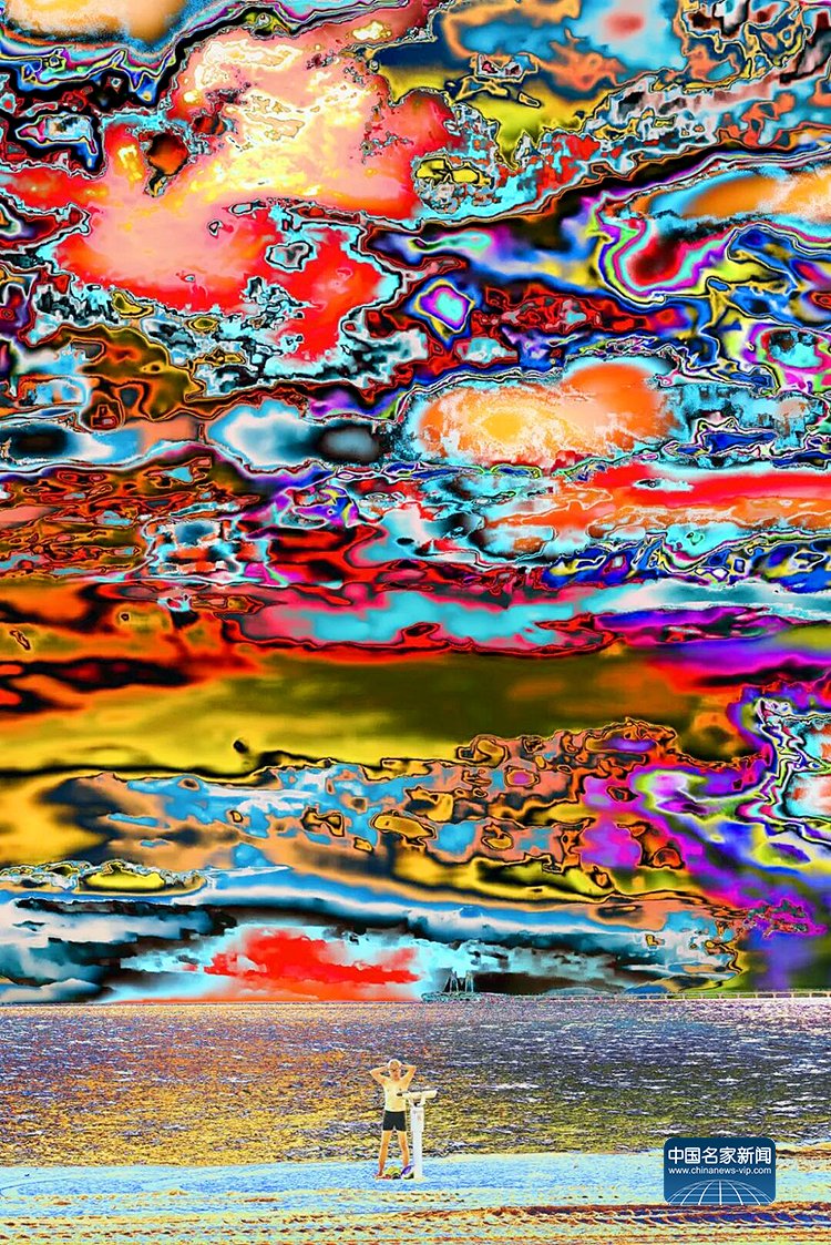 官宏滔进一步阐释,数码摄影的本质是数据捕捉,而人类习惯的颜色不过是人眼与大脑的主观处理结果,现实本身拥有无限种可能性,这与量子力学中的“观测者效应”不谋而合——观测行为本身会影响被观测对象,所谓“现实”,不过是主观视角下的定型认知。此次展出的《非观:天开之时》(2020)、《非观:最后的浸礼》(2023)、《非观:破译中50%》(2022)、《非观:最后的冬泳》(2023)等系列作品,完整呈现了他的创作脉络:从盘古开天的神话意象,到信息之海的个人感悟;从“山是水、水是山”的万物共生理念,到数字时代人类生存状态的叩问,每一件作品都融入了他跨越中西文化的生活体验,将抽象的哲学思考转化为可感知的视觉艺术。