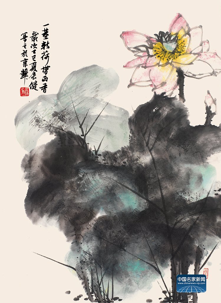 “A Single Fresh Lotus Stalk Carries the Fragrance after Rain” (69×47cm) by Qu Jian in 2025