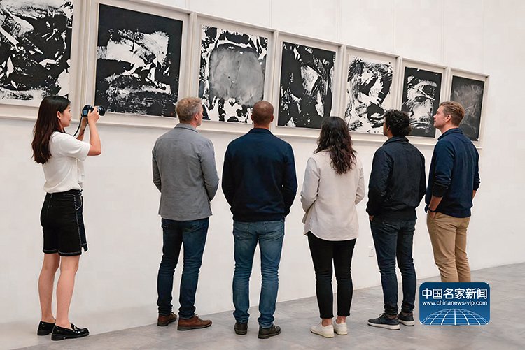 The audience admires the ink series works created by Li Geng at the exhibition site