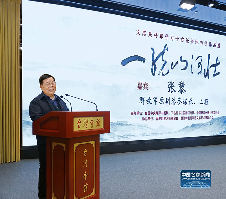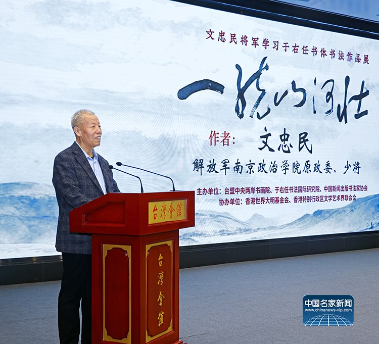 中国文化人物(记者 马将平 苏晴)笔墨传情寄初心,文脉相连聚同心。1月15日,由台盟中央两岸书画院、于右任国际书法研究会、中国新闻出版书法家协会联合主办,世界大明基金会(香港)、香港特别行政区文学艺术界联合会协办的“一统山河壮——文忠民将军学习于右任书体书法作品展”在北京台湾会馆隆重开幕。本次展览以文忠民将军研习近代书法巨匠于右任“标准草书”的艺术成果为核心,搭建起两岸文化艺术交流的桥梁,用笔墨丹青传承爱国情怀,诠释两岸同根同源的血脉羁绊。