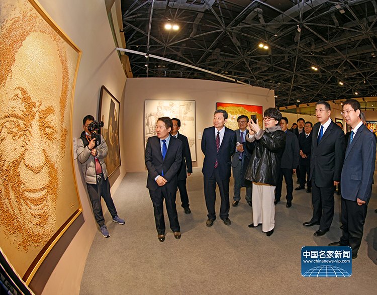 中国文学艺术界联合会党组书记、副主席张政,中共北京市委常委、宣传部部长孙军民,中国文学艺术界联合会党组成员、副主席诸迪,中国美术家协会主席范迪安,中国美术家协会分党组书记、驻会副主席屈健等在展览作品前听取艺术家的介绍