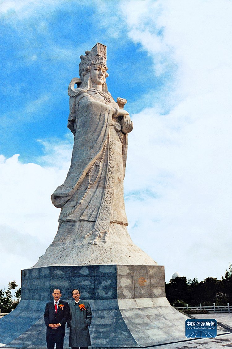 梁晚年创作的汉白玉妈祖雕像(19.99米高)矗立在澳门路环迭石塘山顶